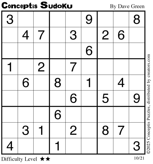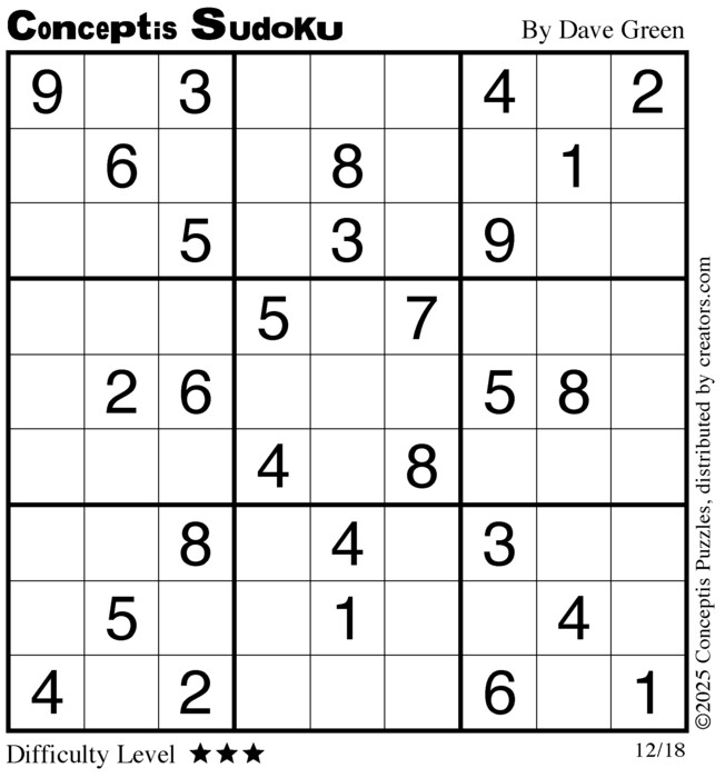 Each puzzle consists of a 9x9 grid containing given clues in various places. The object is to fill all empty squares so that the numbers 1 to 9 appear exactly once in each row, column and 3x3 box.