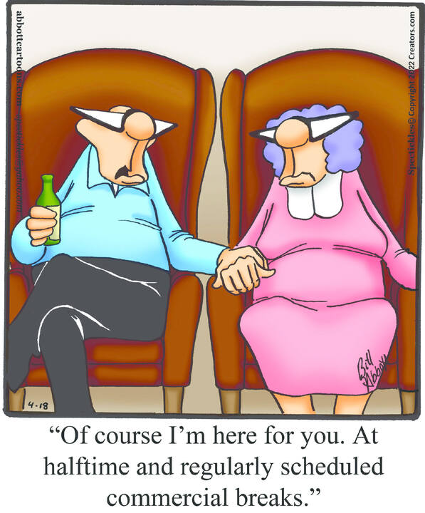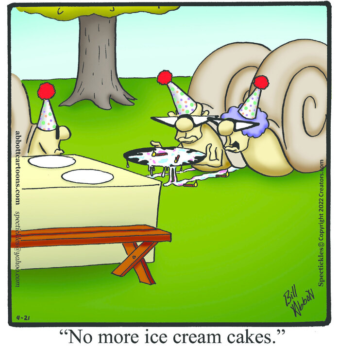 Spectickles, a cartoon primarily about a married couple with, to put it mildly, communication challenges, is an amalgamation of physical traits that author Bill Abbott finds humorous: the deadpan expression and gravity-tugged flesh of Walter Matthau, the powerful presence of Ethel Merman, the glasses of his great-grand-parents and a host of other subtleties.