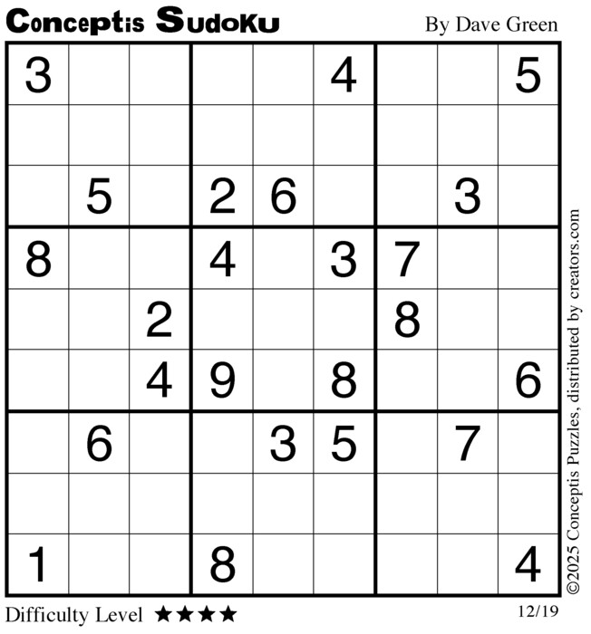 Conceptis Classic Sudoku for Dec 19, 2025
